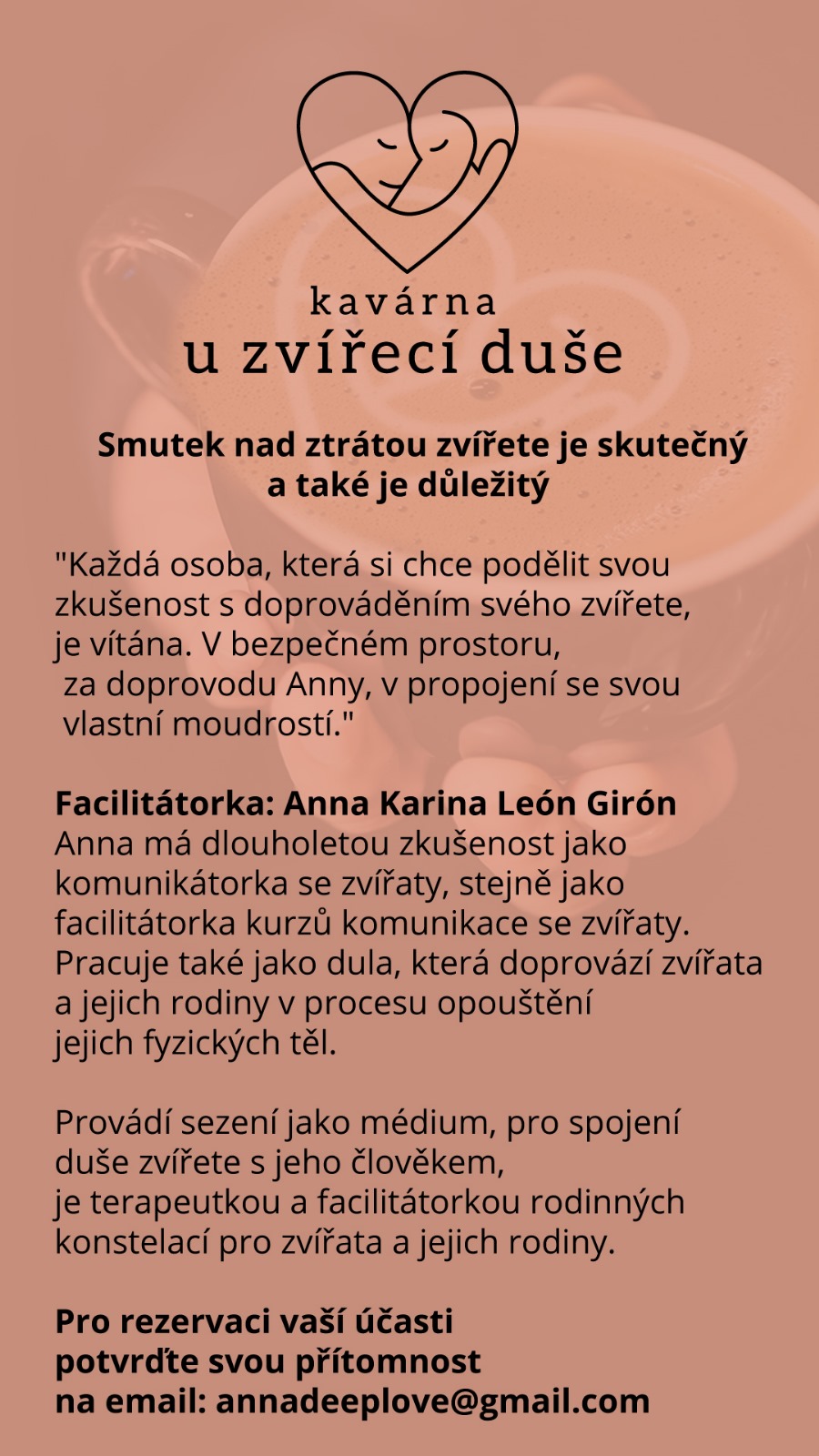 Kavárna U zvířecí duše je otevřený a bezpečný prostor pro rozhovor o smrti našich zvířat, stejně jako o všem, co se rozvíjí kolem smrti našich milovaných zvířecích společníků.